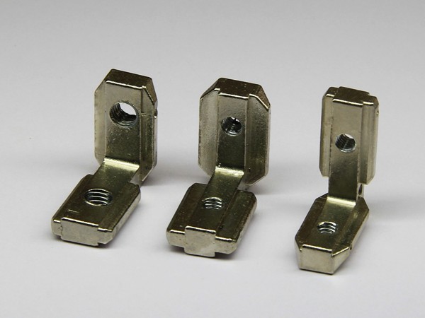 用途:用于兩根型材的直角連接,安裝時將其兩端分別插入型材槽坑內(nèi),將緊定螺釘鎖緊,根據(jù)型材的槽寬與連接方式請選用不同角槽連接件。